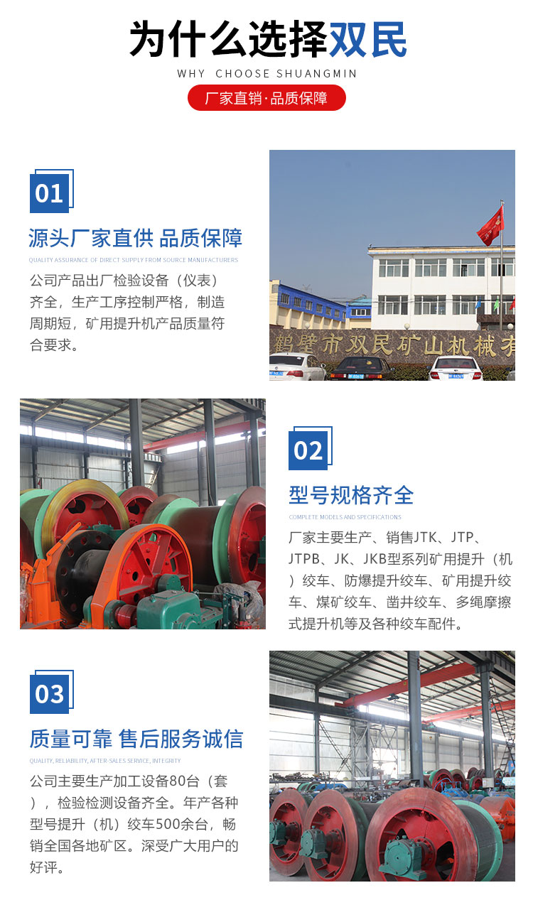 鑿井絞車廠家,以制造大型礦山提升設(shè)備,電器成套自動化控制系統(tǒng)為主的科研型高科技企業(yè),是國家礦山專用設(shè)備及配件產(chǎn)品定點生產(chǎn)單位。主要生產(chǎn)、銷售JTK、JTP、JTPB、JK、JKB、JKM、JKMD型系列礦用提升絞車、礦井提升機(jī)、多繩摩擦式提升機(jī)、JZ型